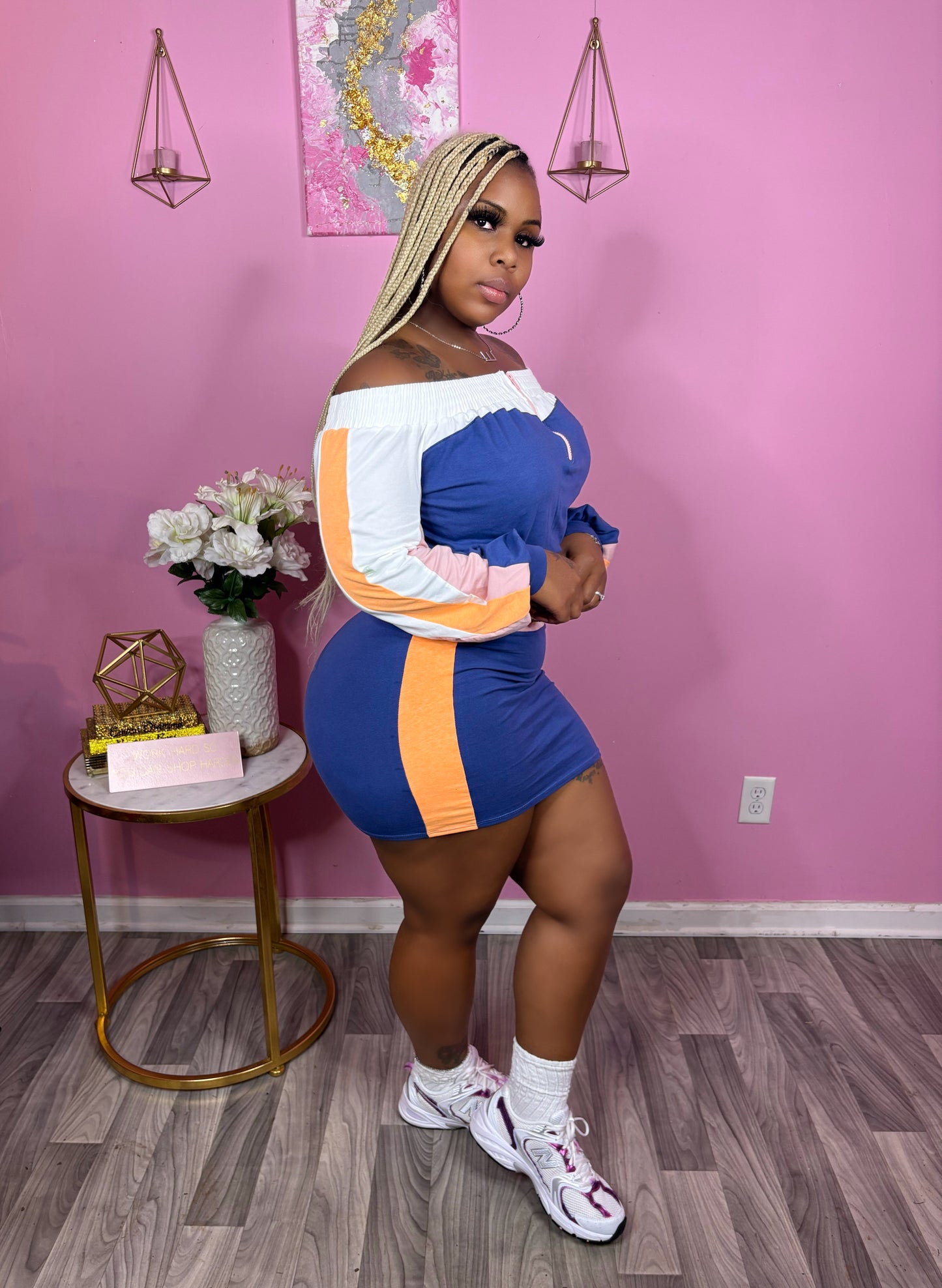 Fun & sporty color block skirt set! Off shoulder zip crop jacket with