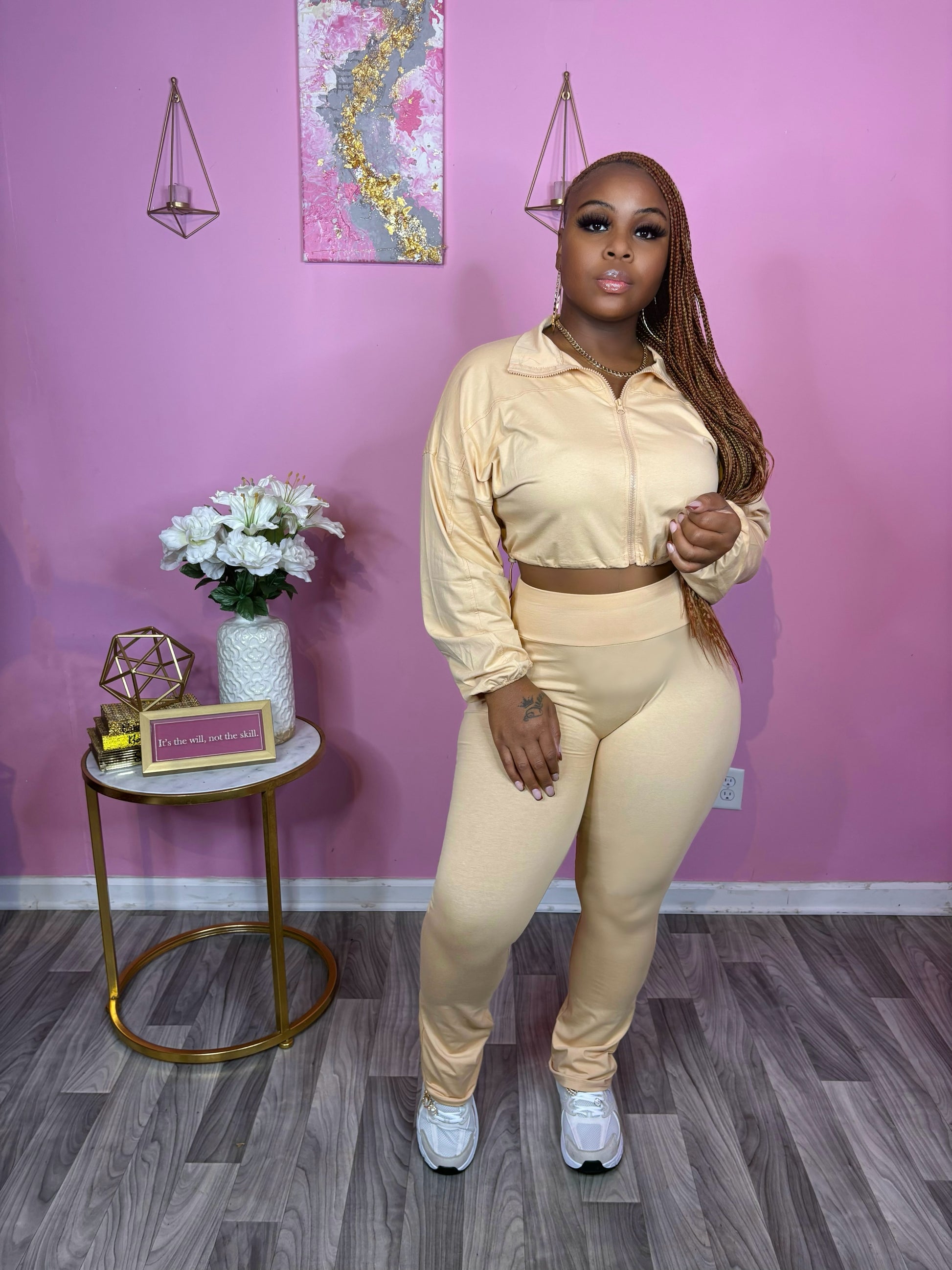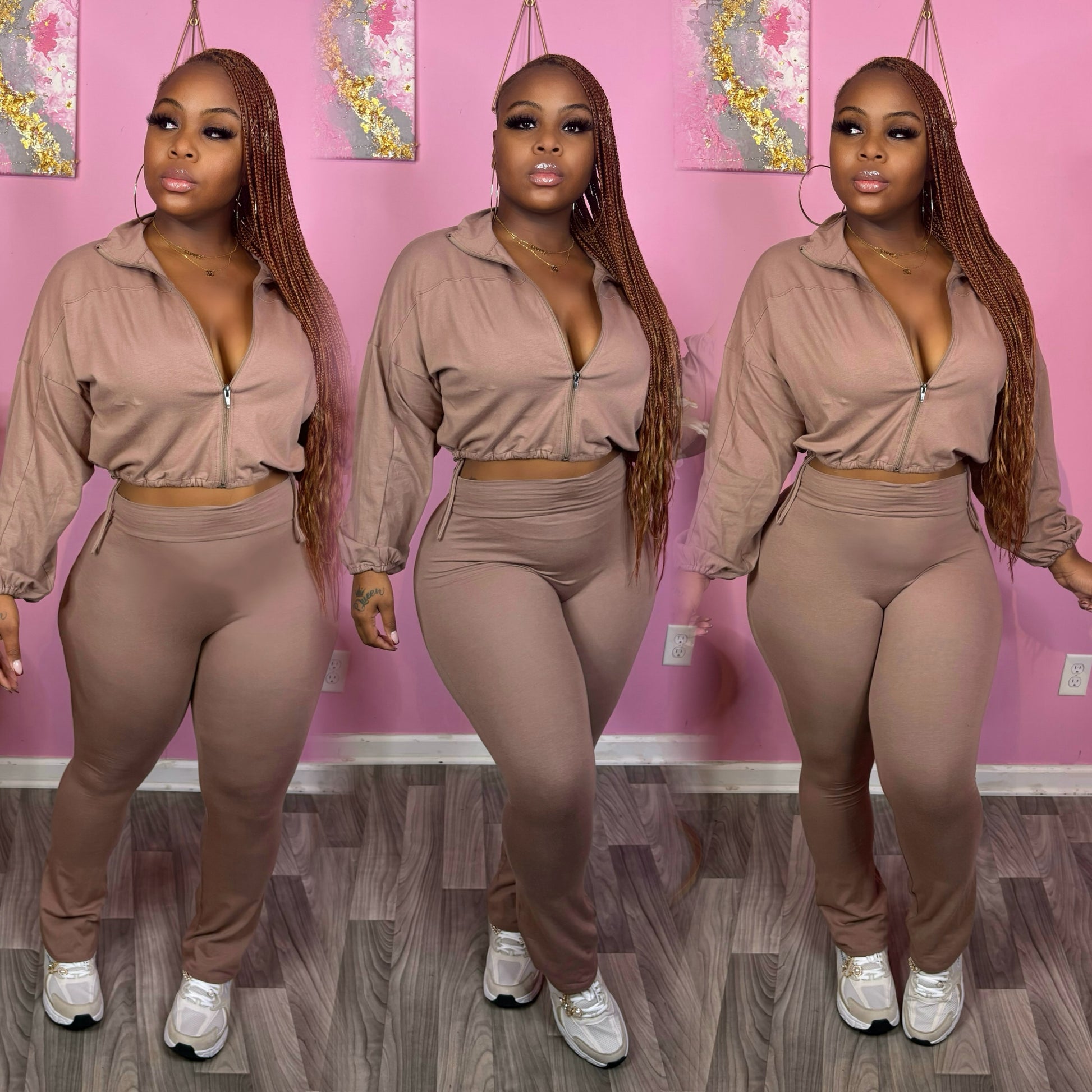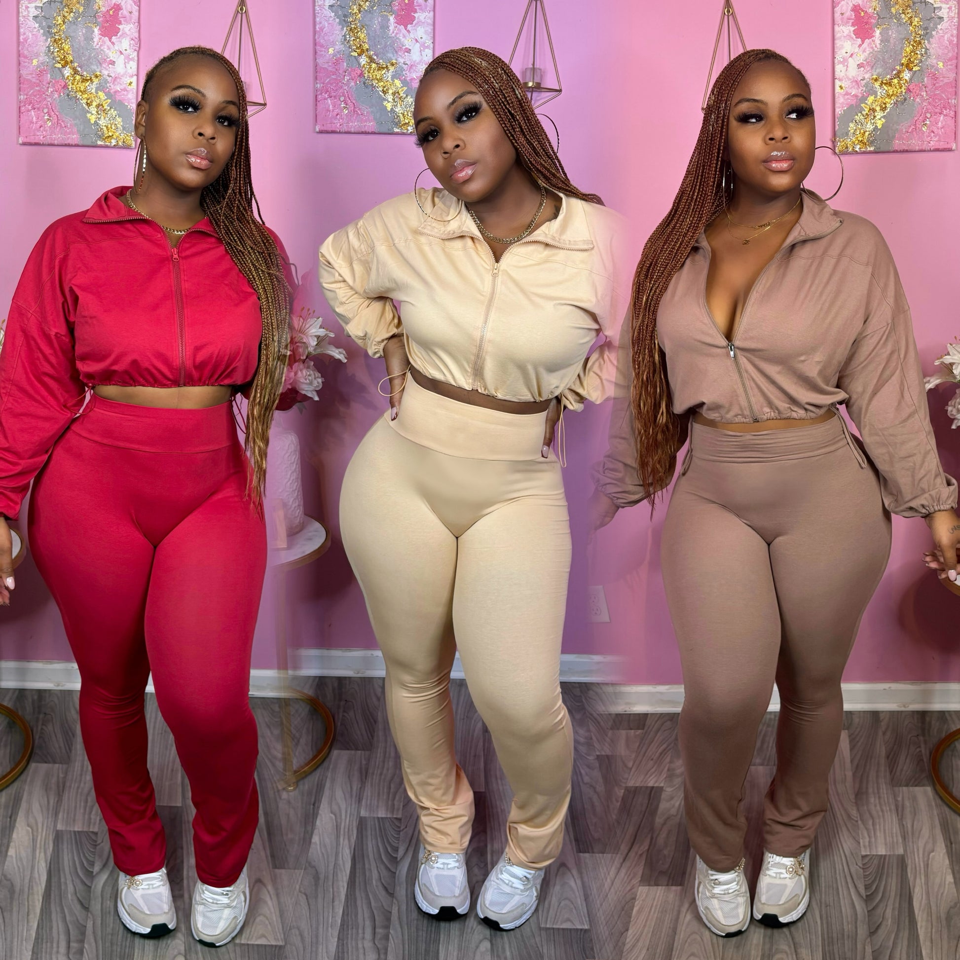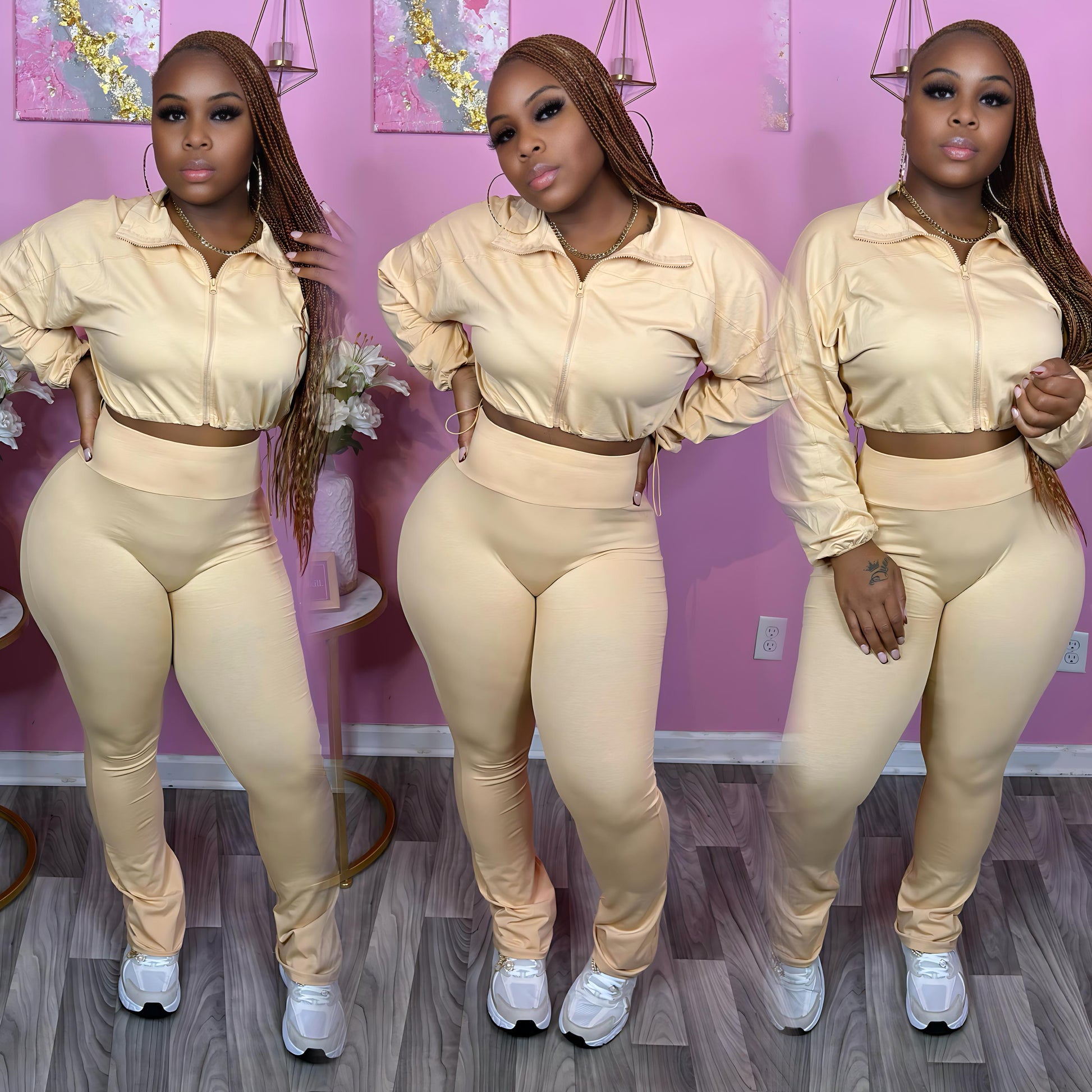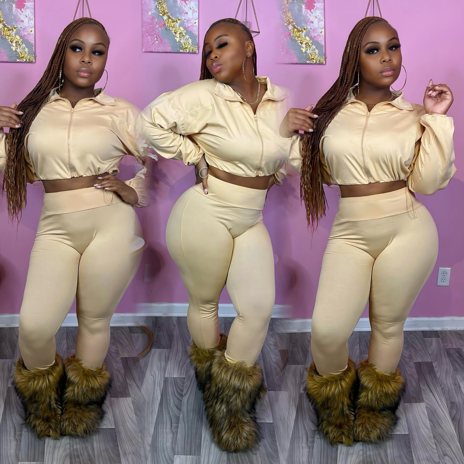 Cute chill solid color active 2pc cotton set with long bubble sleeve zipper front crop top and matching high waist leggings Buttery soft feel. Fabric is very stretchy. Extremely well made.