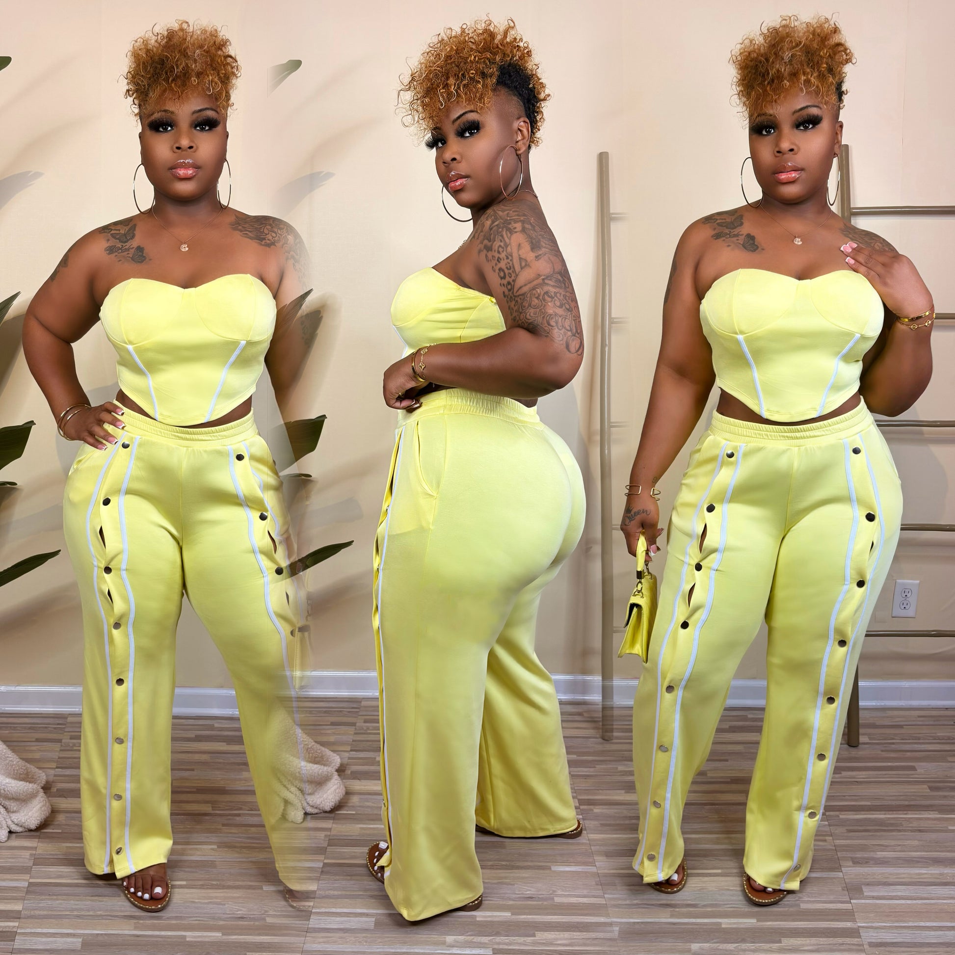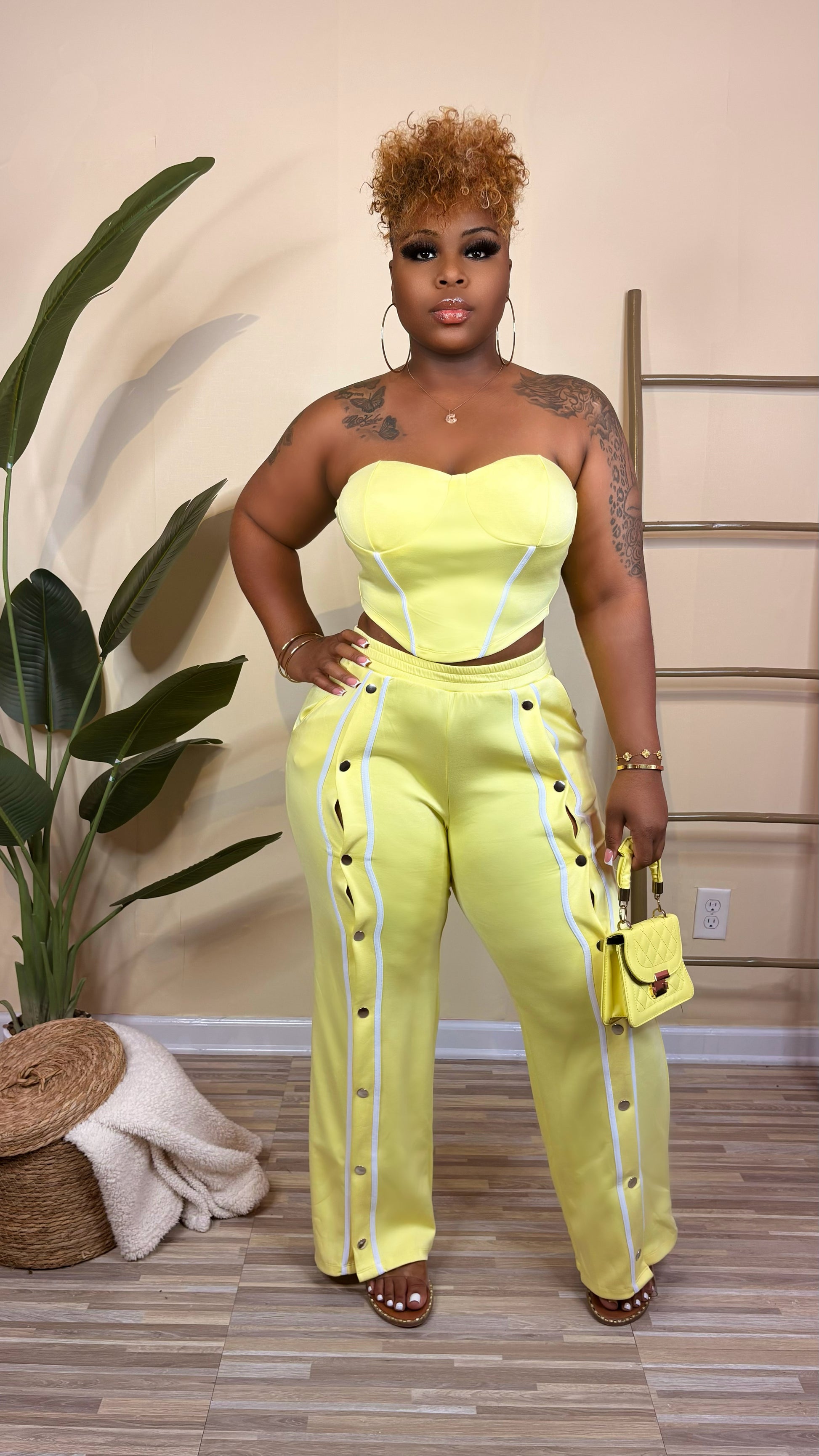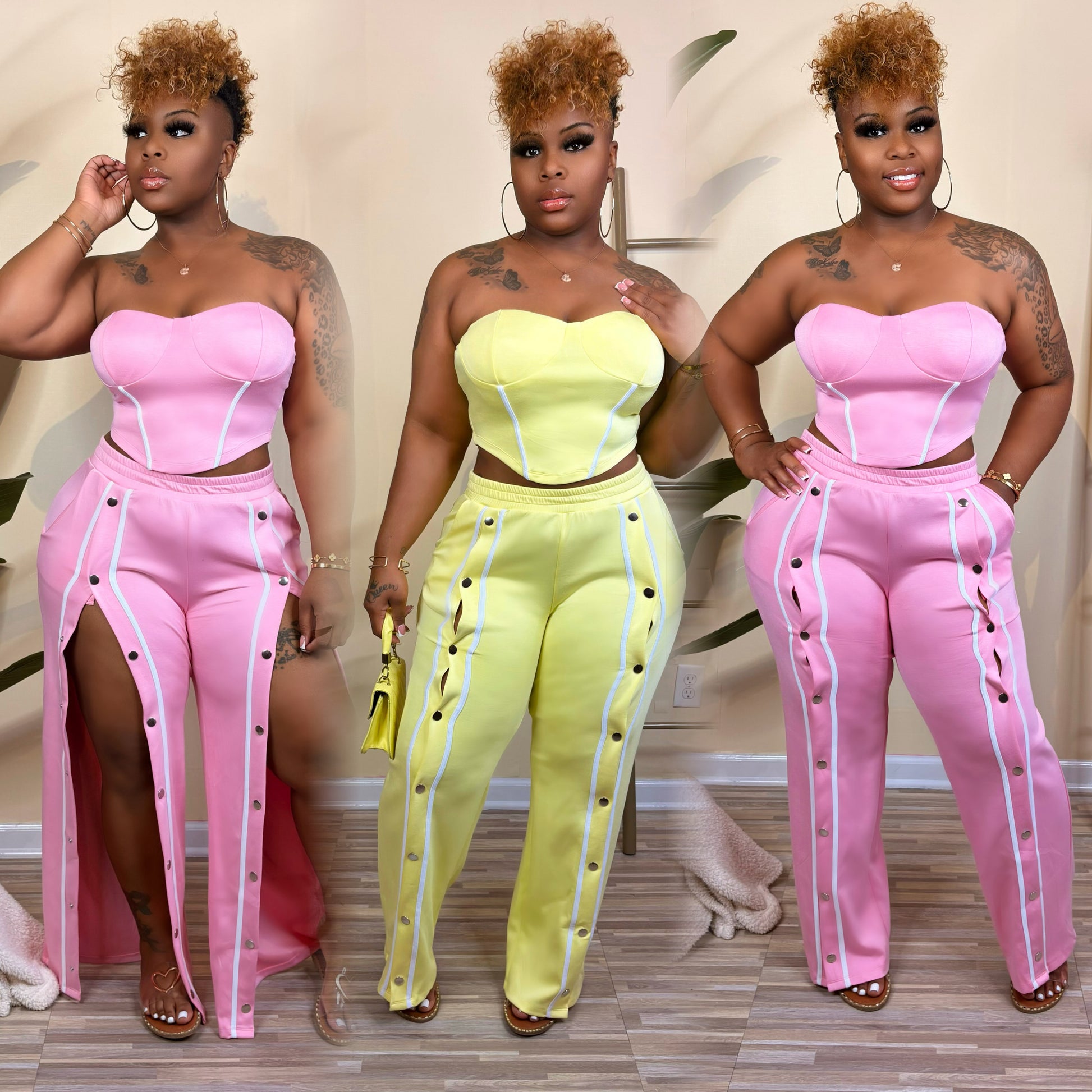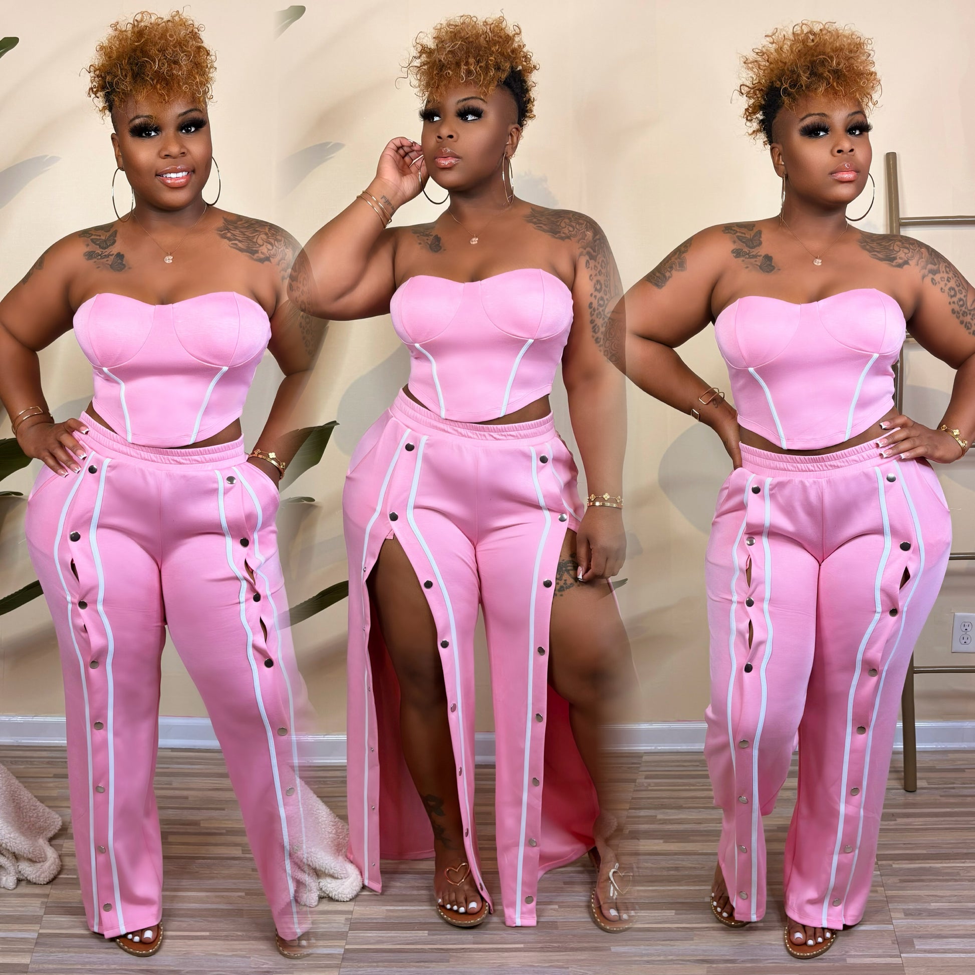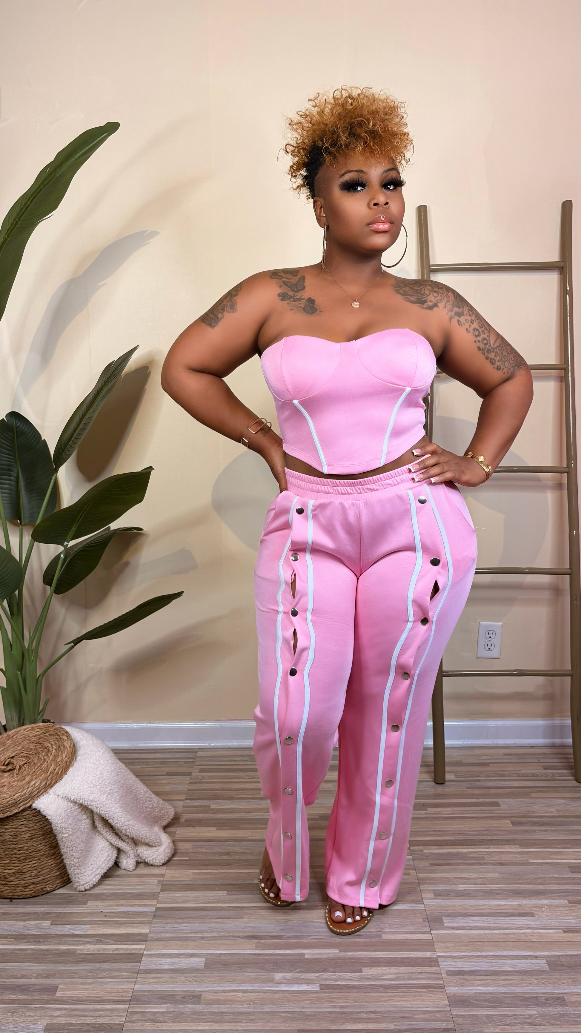 Serve pretty with an edge in this cute two‑piece set. Designed with a sleek corset‑style top and high‑waisted snap‑button pants, this look hugs your curves while keeping it effortlessly cool.